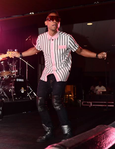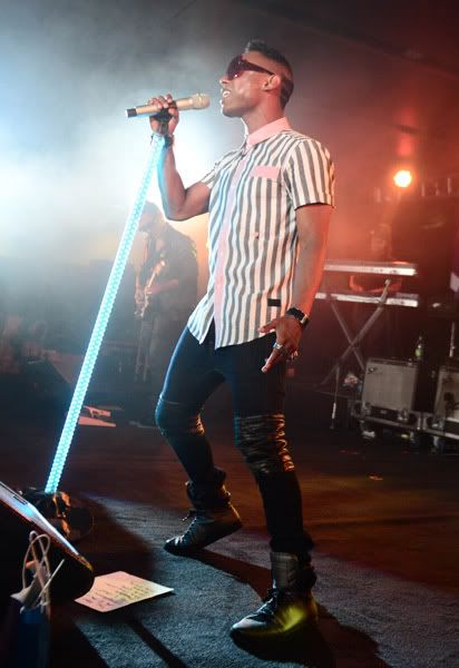 His charm was to "OMG" and he flew above the crew on to the stage riding on this neon green lit plank. Craziness.